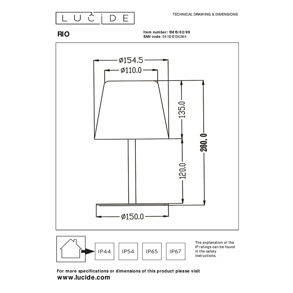The LED Outdoor Rechargeable Table Lamp RIO is a practical and versatile lighting solution for your outdoor area. With a diameter of 15.5 cm and a power consumption of 1.8W, it provides pleasant warm white light with a color temperature of 3000K and a luminous flux of 150lm.