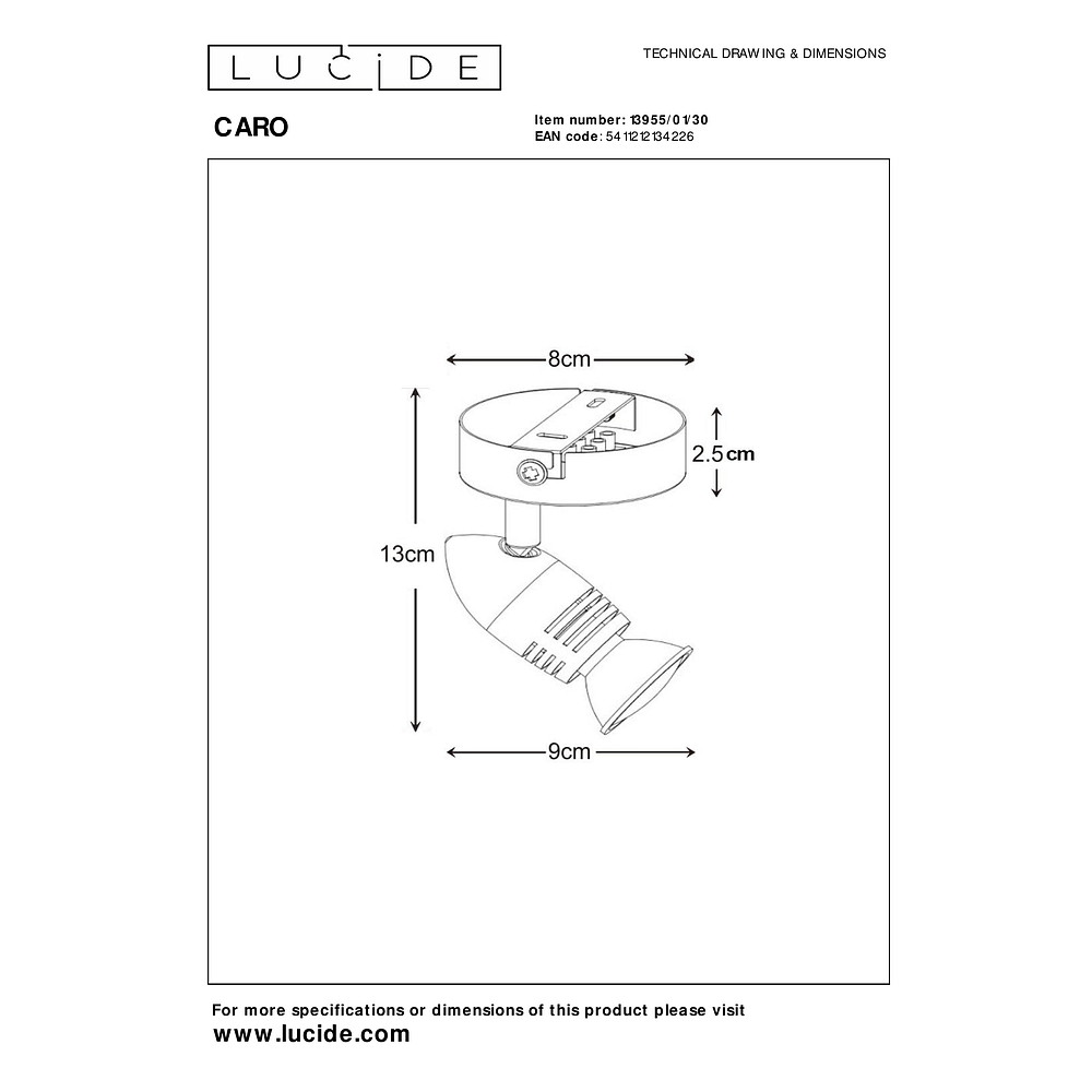 The CARO ceiling spotlight comes with a GU10 base and requires an operating voltage of 230V. The canopy has a diameter of 8.5 cm and a height of 2.5 cm. The swiveling shade measures 4x4x7.5 cm and allows for targeted light direction.