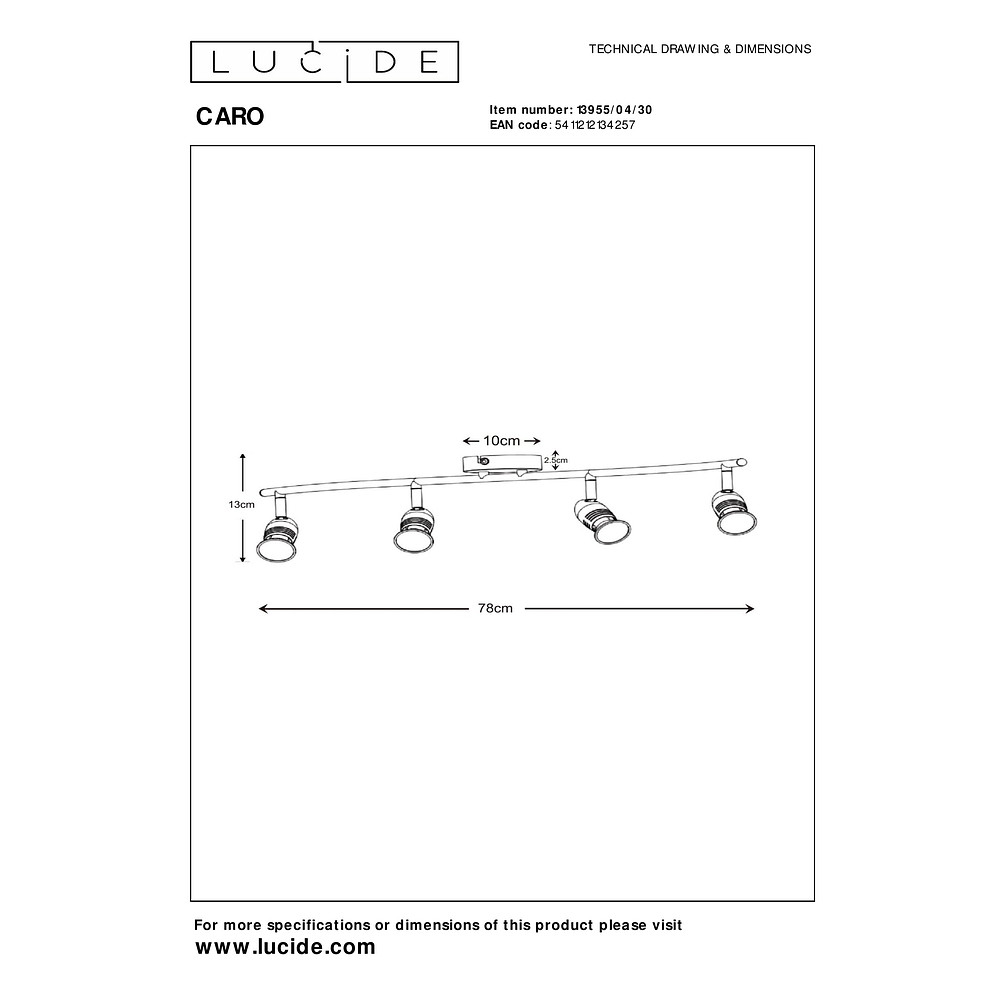 The CARO ceiling spotlight from Lucide is a stylish and modern lighting element for your interior. With dimensions of 76 x 9 x 13 cm, this spotlight provides ample light for various rooms.