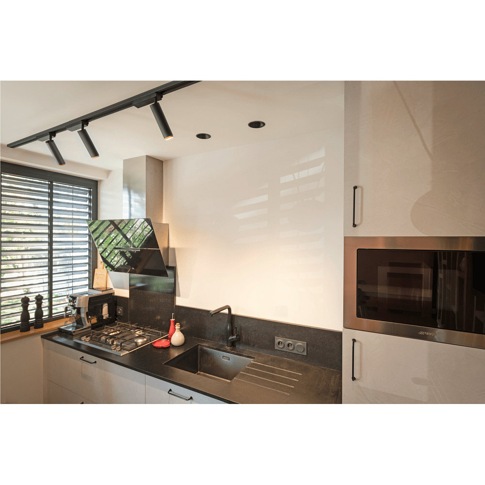 The LED spotlight is made of high-quality aluminum and stands out with its black color. It is mounted via a track system, and the accessories, including the operating device and the 1-phase adapter, are included. With a weight of only 0.27kg, the spotlight is easy to install yet provides a stable lighting solution.