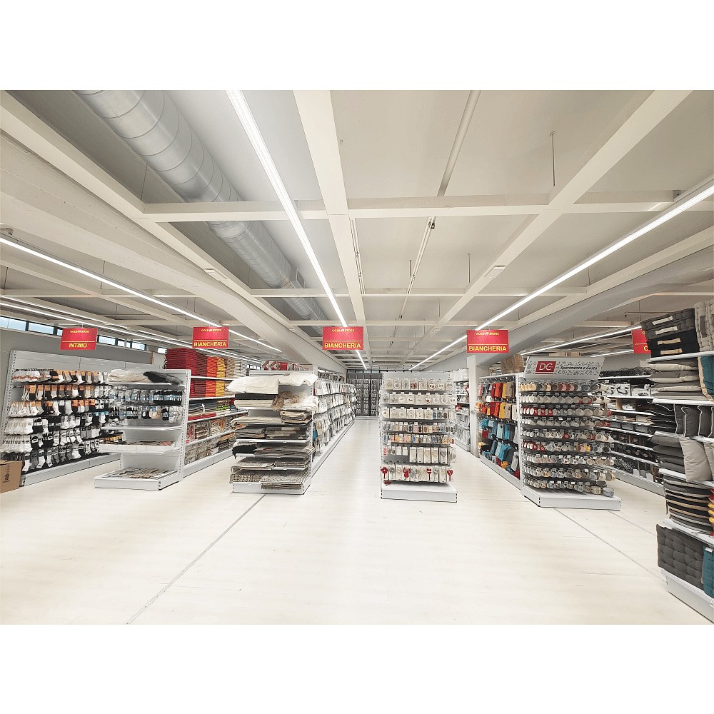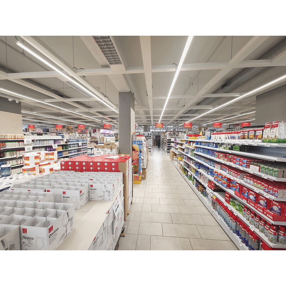 Thanks to the SMD LED 2835 light sources with a total of 192 LEDs, the LINEAR PRO 120 CCT produces uniform, symmetrical lighting on both sides of the aisle across the entire shelf height. The diffuse light distribution in the center ensures even illumination of the corridor itself. With a color rendering index of over 90Ra, the luminaire provides excellent color rendering for optimal presentation of goods.