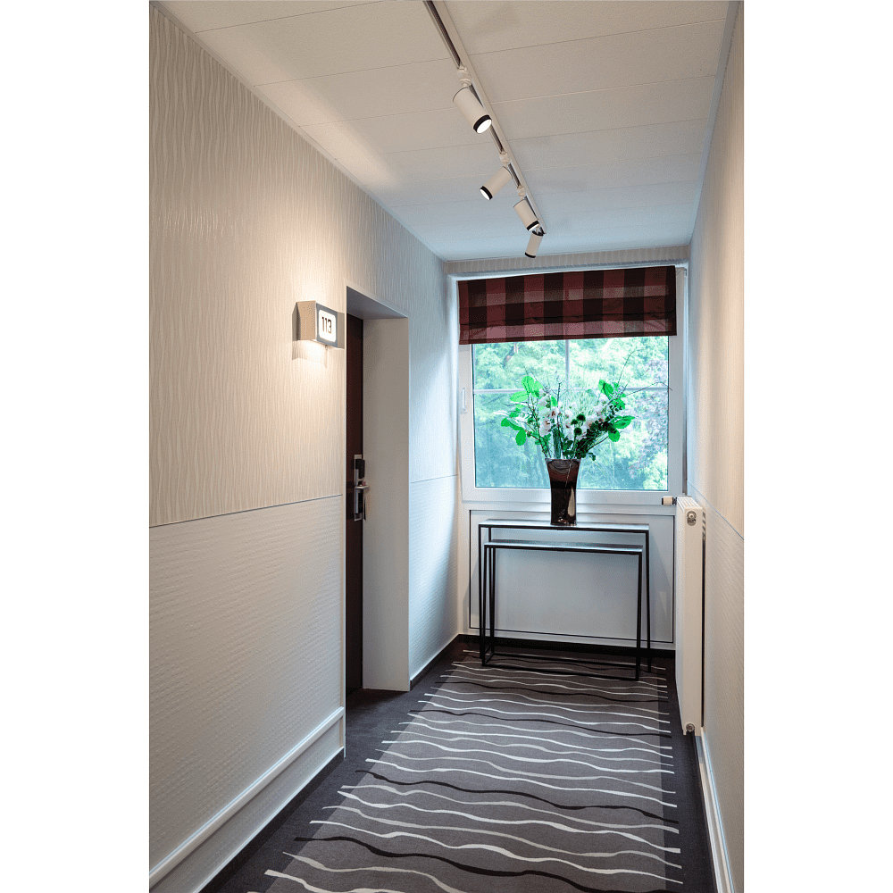 The spotlight is attached to a track system and is flexible adjustable thanks to its rotating and swiveling function. With a weight of only 0.23kg and dimensions of 7.9 x 5.7 x 15.3 cm, it is compact and inconspicuous in any room.