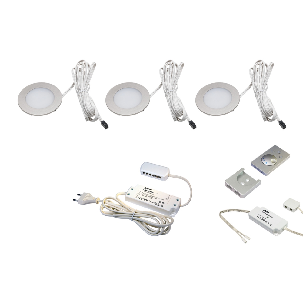 3er Set DYNAMIC LED Einbaustrahler FR 55-LED 3W, rund, Edelstahloptik, 24V DC, Funk-FB-Anbau, Trafo LED-24 / 15W