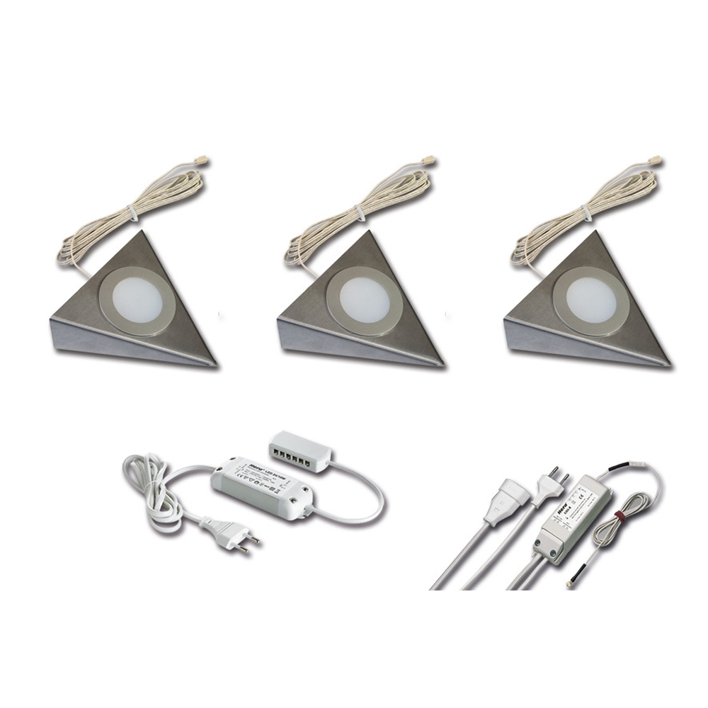 3er Set LED Dreieck-Unterbauleuchte UL 2-LED F, mit EBS 4 Schalter + Trafo LED-24 / 15W, Edelstahl, 3W 3000K