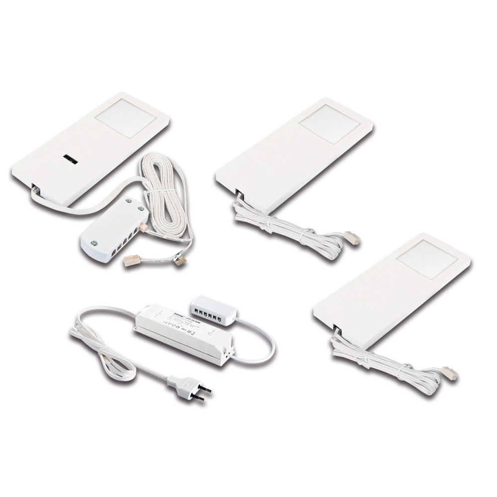 3er Set LED Unterbauleuchte LED SLIM-PAD F, IP20, mit IR Dimmer + Trafo LED-24 / 30W, 5W 3000K, weiß