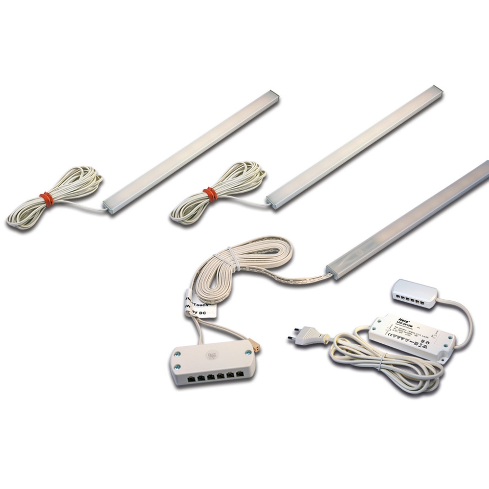 3er Set Unterbauleuchte LED ADD-ON MINI + LED Trafo LED-24 / 15W + Touch-Dimmer, 4.3W 3000K 280lm 110°, Alu eloxiert