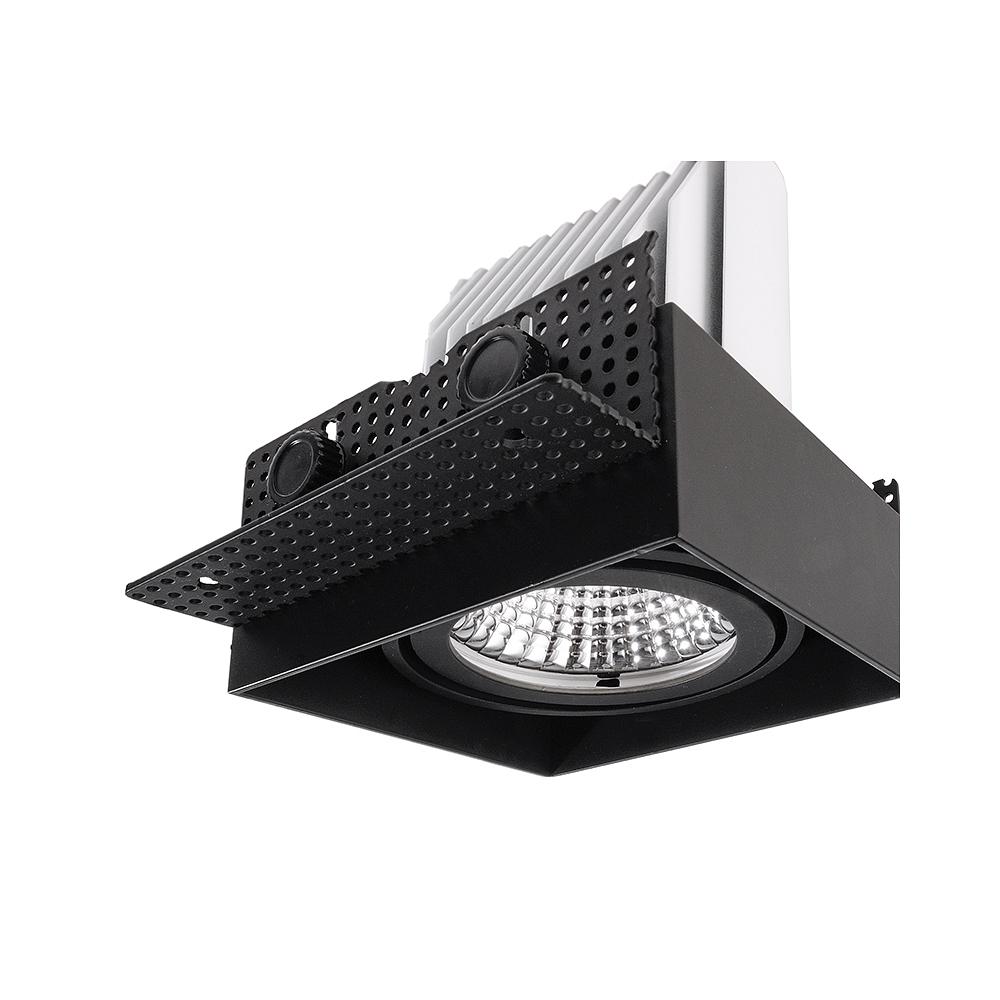 The cardan insert is made of aluminum and weighs only 0.745 kg. It is pivotable and has a medium lamp lifespan of 50000 hours. The installation opening measures 12 cm in length and width.