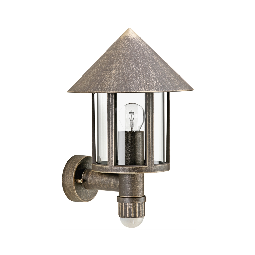 Außenwandleuchte Landhaus Kegeldach modern Typ Nr. 1824 mit Bewegungsmelder, Alu-Guss / Acrylglas klar, Braun-Messing