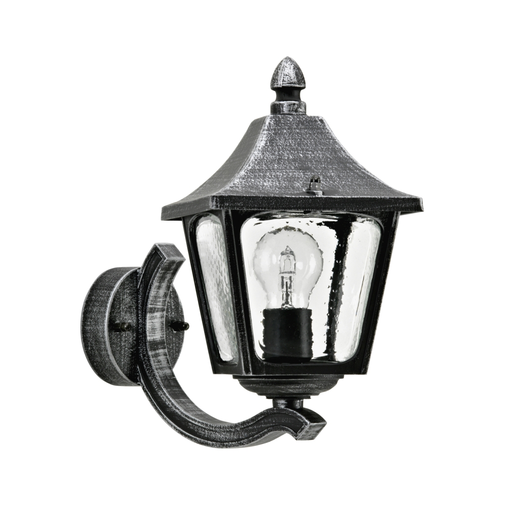 Außenwandleuchte Landhausstil eckig Typ Nr. 1820, stehend mit Wandarm, IP44, E27, Alu-Guss / Hohlglas klar, Schwarz