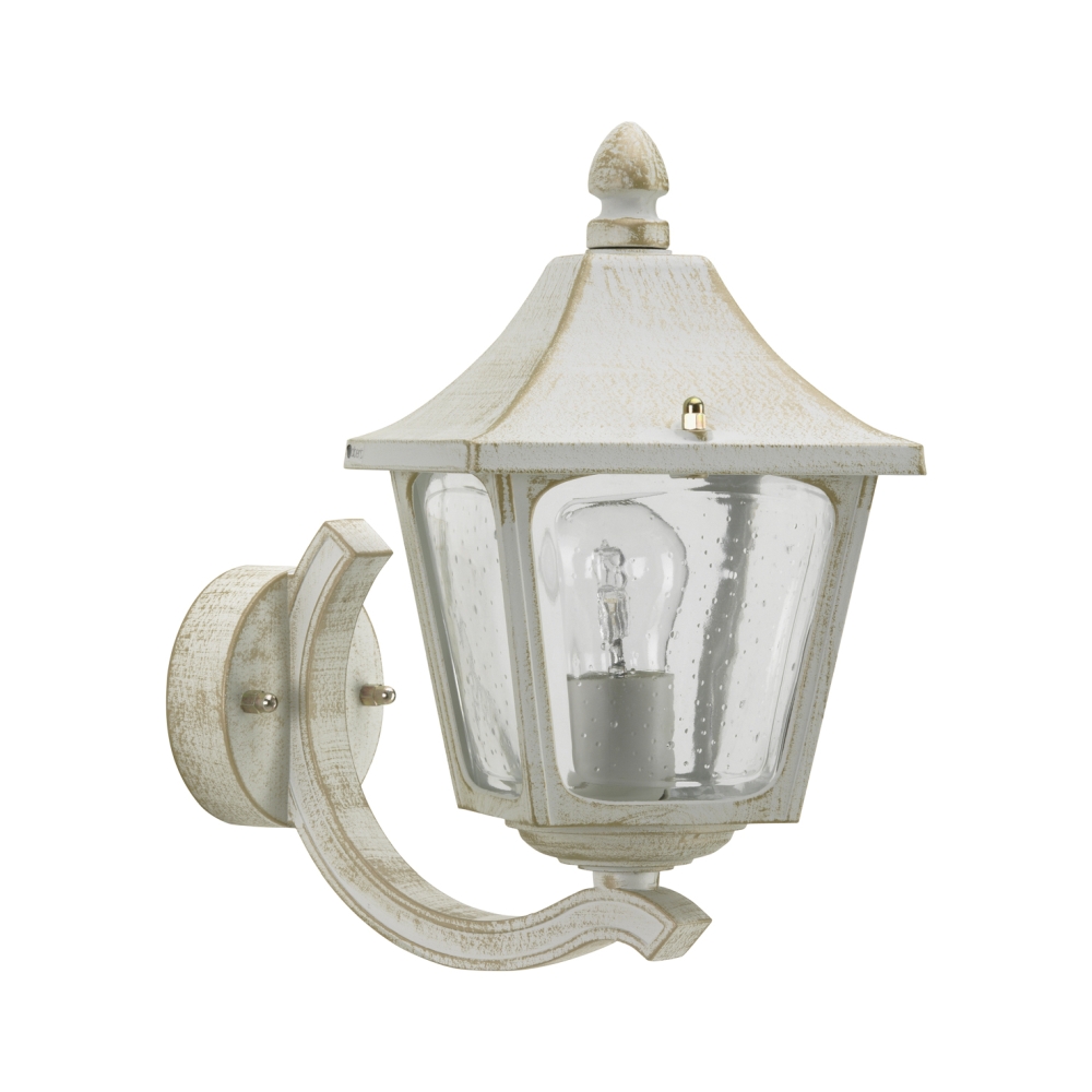 Außenwandleuchte Landhausstil eckig Typ Nr. 1820, stehend mit Wandarm, IP44, E27, Alu-Guss / Hohlglas klar, Weiß-Gold