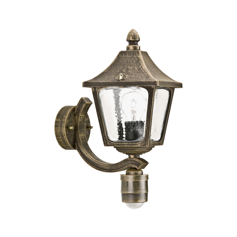 Außenwandleuchte Landhausstil eckig Typ Nr. 1822 mit Bewegungssensor, IP44, E27, Alu-Guss / Hohlglas klar, Braun-Messing matt