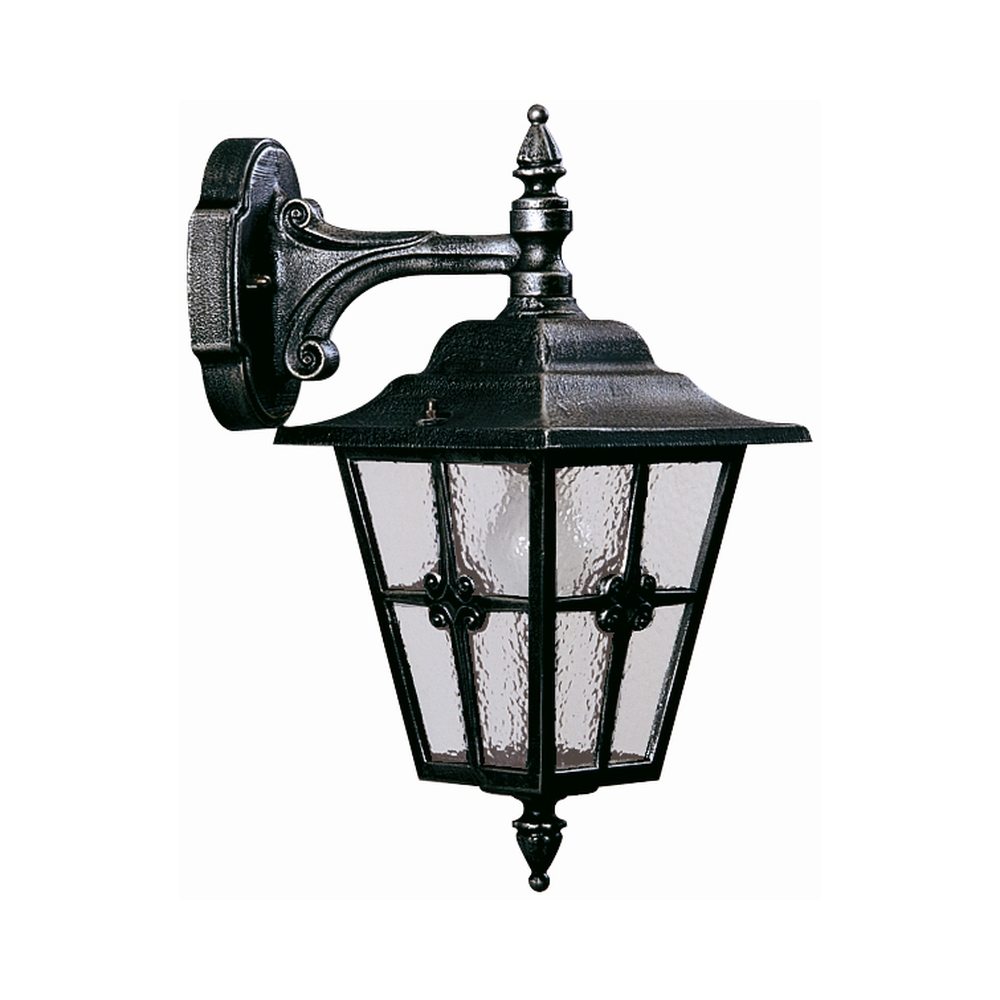 Außenwandleuchte Landhausstil Kreuzstrebe Typ Nr. 1805, hängend an Wandarm, IP23, E27, Alu-Guss / Kathedralglas, Schwarz