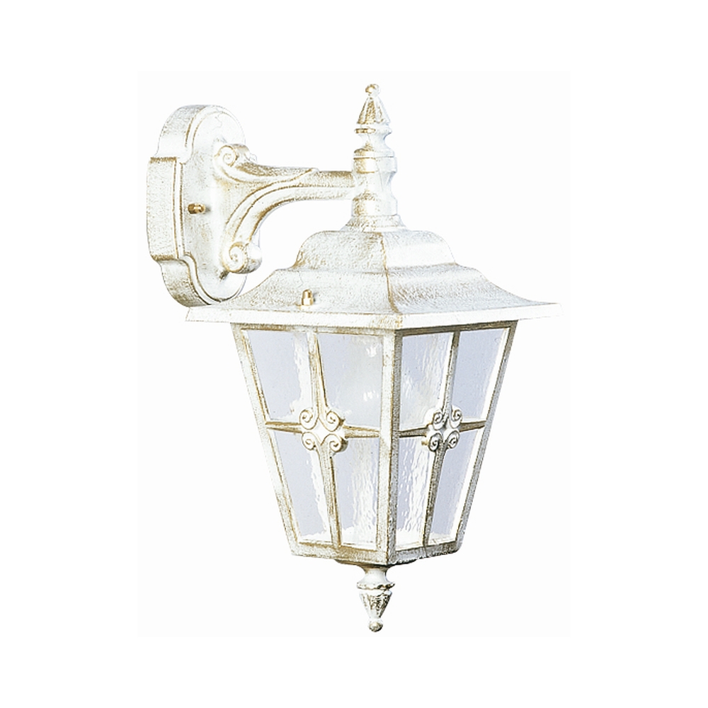 Außenwandleuchte Landhausstil Kreuzstrebe Typ Nr. 1805, hängend an Wandarm, IP23, E27, Alu-Guss / Kathedralglas, Weiß-Gold