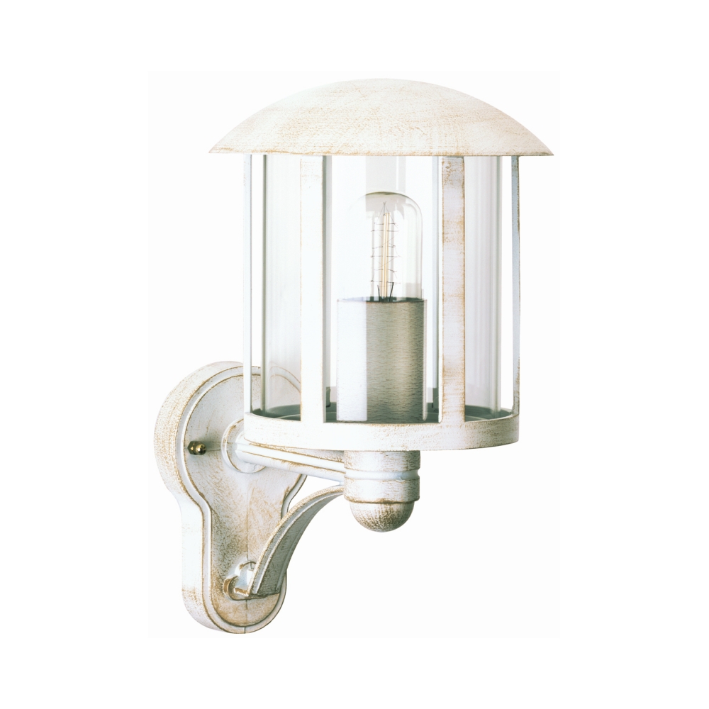 Außenwandleuchte Landhausstil Vintage Typ Nr. 1834, stehend mit Arm, IP23, E27 QA55 max. 57W, Alu-Guss / klar, Weiß-Gold