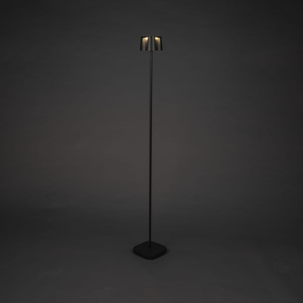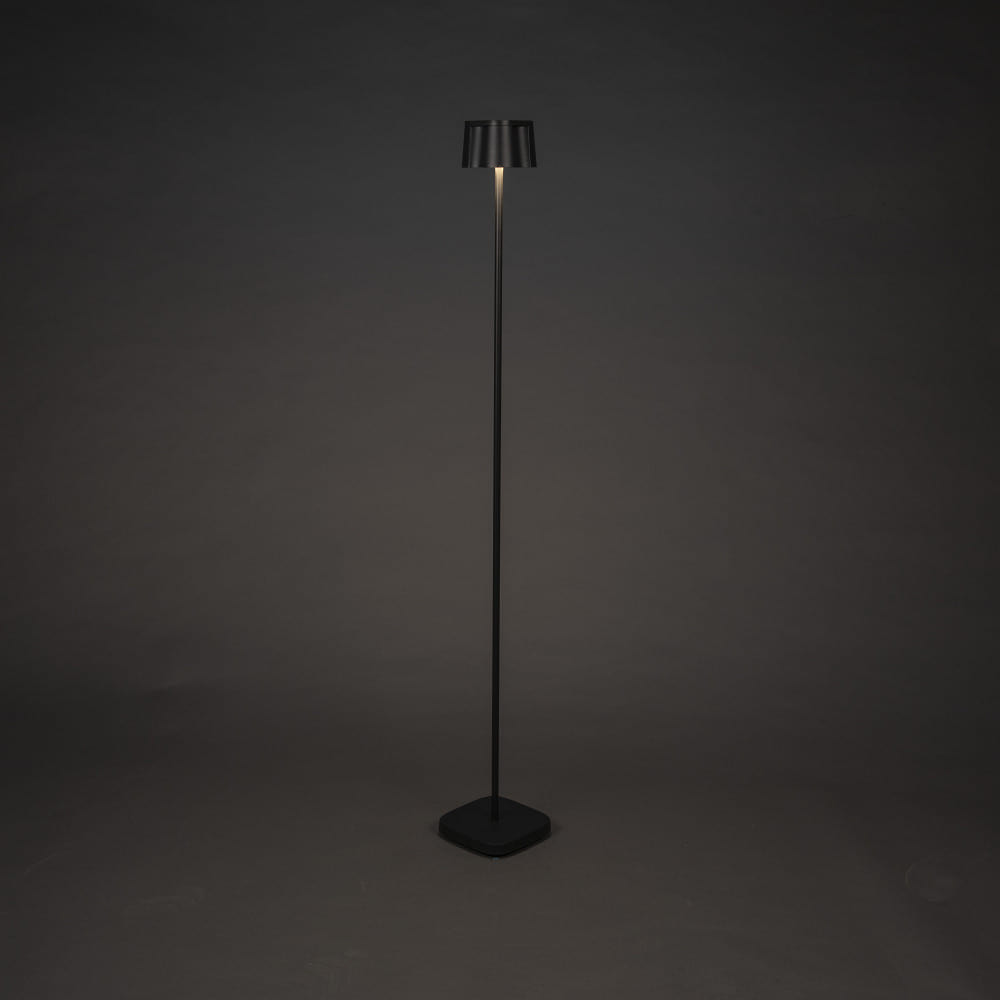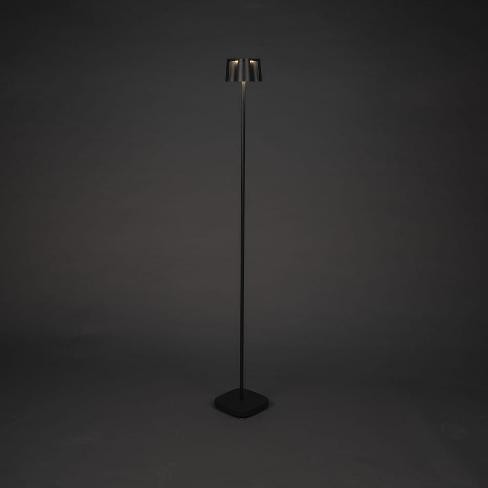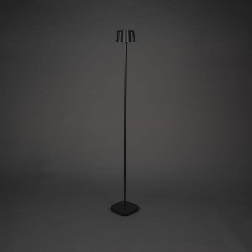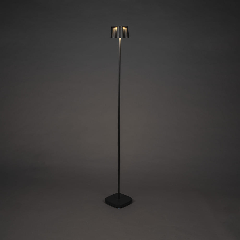 The Outdoor LED Battery Floor Lamp NICE by Konstsmide is a versatile lighting element for indoor and outdoor use. With dimensions of 17 x 120 x 17 cm and a weight of 2.5 kg, it provides a wide, glare-free downward emission and creates special lighting effects through a sophisticated lighting concept.