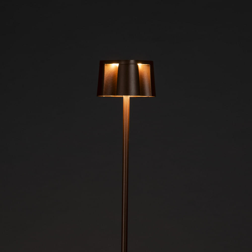 The NICE floor lamp features a touch sensor for easy operation. It has a built-in battery and can be charged via a contact charging station with a USB connection. The high-quality aluminum construction and IP54 protection make it ideal for outdoor use, such as on your garden table.