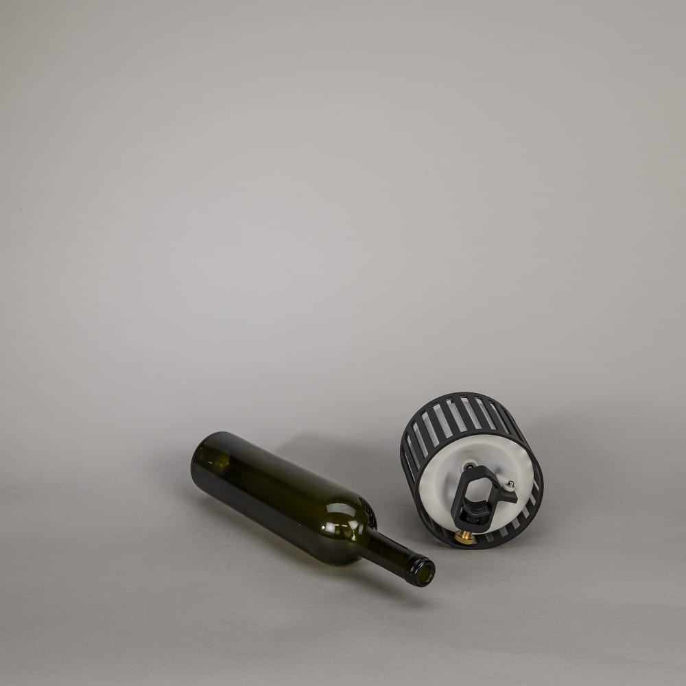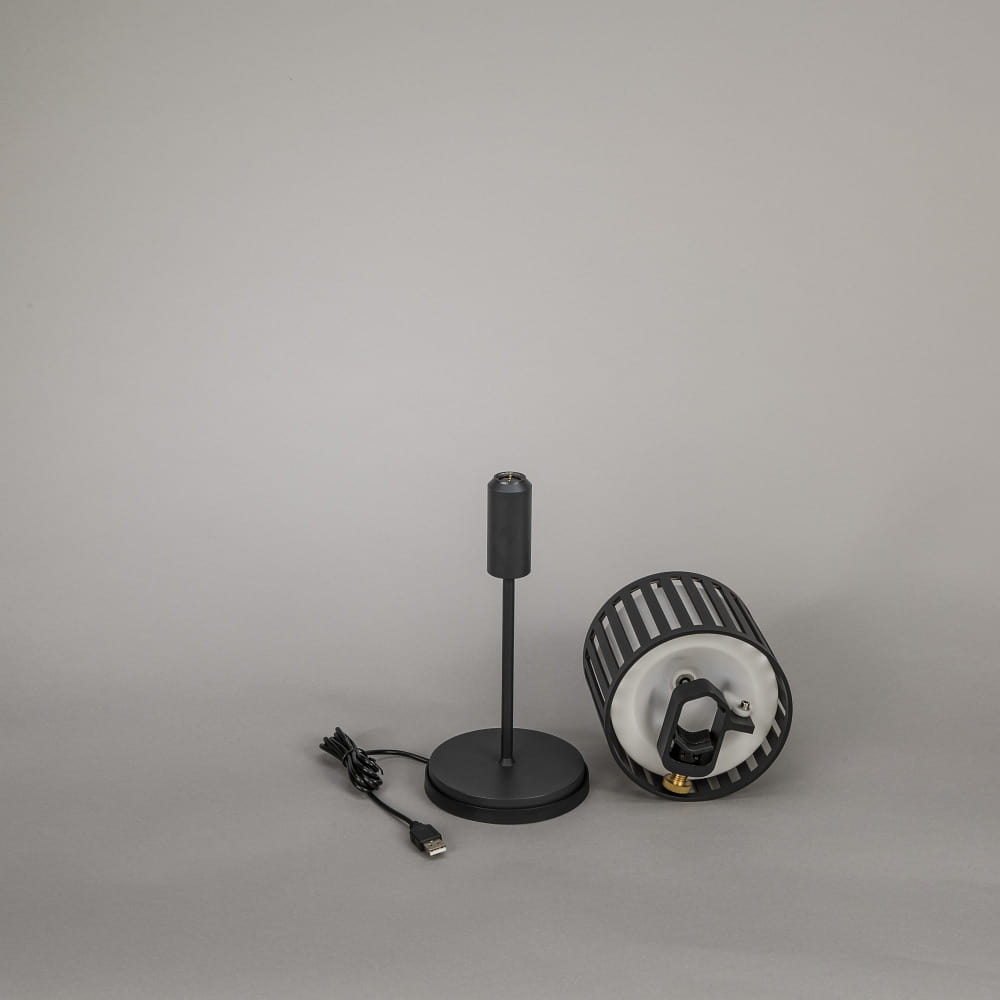The table lamp has a built-in battery (3.7V DC, 2x Li-Ion Type 903050) and can be recharged via a contact charging station with USB connection. The lamp head can be used on the included base or can be removed and placed on top of a bottle.