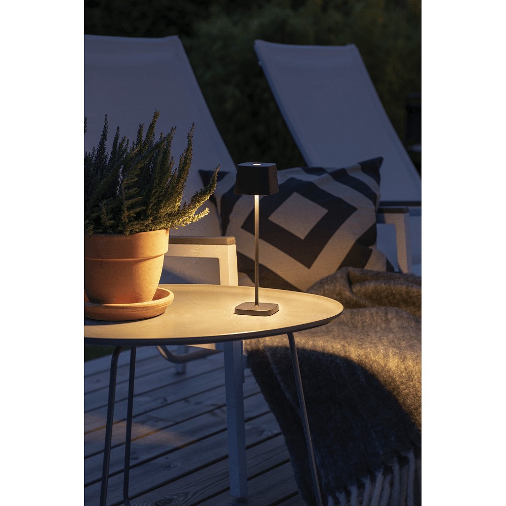 The battery table lamp CAPRI MINI comes with a battery and dimmer, allowing for easy setup. The battery life lasts up to 9 hours, perfect for long summer evenings outdoors.