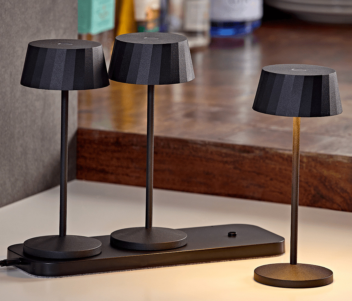 The LED rechargeable table lamp FACETTA from SIGOR is presented in a practical set of 3 and impresses with its timeless design in night black. With a compact size of 22.2 cm in height and a slim lampshade diameter of 9.2 cm, the lamp blends harmoniously into various environments. The light weight of 0.48 kg also makes the lamp particularly handy and flexible to use.