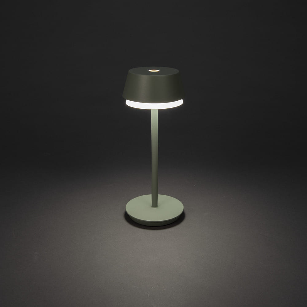 The outdoor LED battery table lamp LYON from Konstsmide is a versatile lighting element that is suitable for both indoor and outdoor use. With a size of Ø/H: 12/30 cm and a weight of 0.567 kg, it is lightweight and easy to handle. The material is made of aluminum and plastic, making the lamp both robust and lightweight.