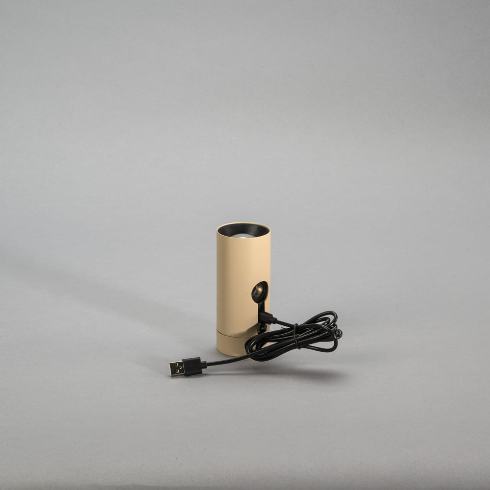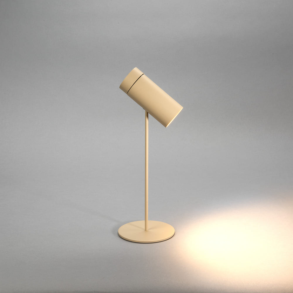 The battery table lamp comes with a base, a USB charging cable, a wall mount, and a table mount. The housing and feet are made of aluminum, indicating high-quality construction. Adjustment is easy with a rotary knob on the bottom of the housing.