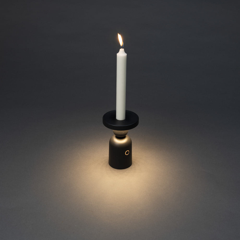 The LED Battery Table Lamp & Candle Holder NANTES is made of high-quality aluminum and plastic. The lamp has a power consumption of 2.5W and an energy consumption of 3kWh/1,000h. Thanks to LED technology, it offers a long average lamp life of 20,000 hours and a luminous flux of 10-120lm.