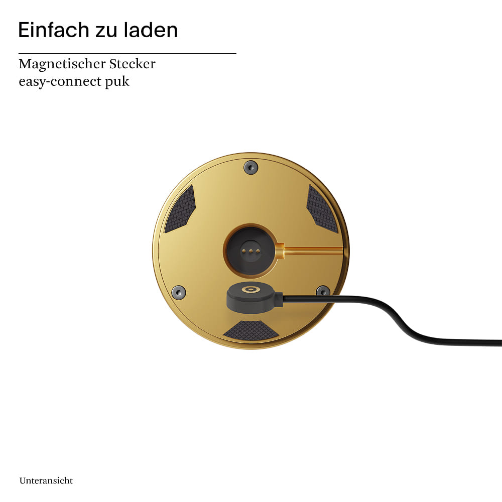The table lamp comes with a battery, a magnetic charging cable, and a USB power adapter, allowing you to take it anywhere. The powder-coated aluminum housing in gold not only gives the lamp a luxurious look but also ensures durability.