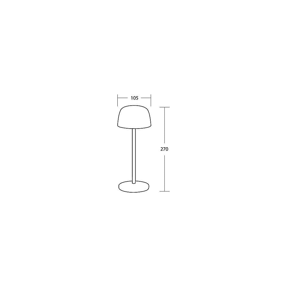 The battery-operated table lamp has a diameter of 10.5 cm and a height of 27 cm. It weighs 0.746 kg and has a Li-Ion battery with a capacity of 3600mAh. The IP54 protection rating ensures safe use outdoors.