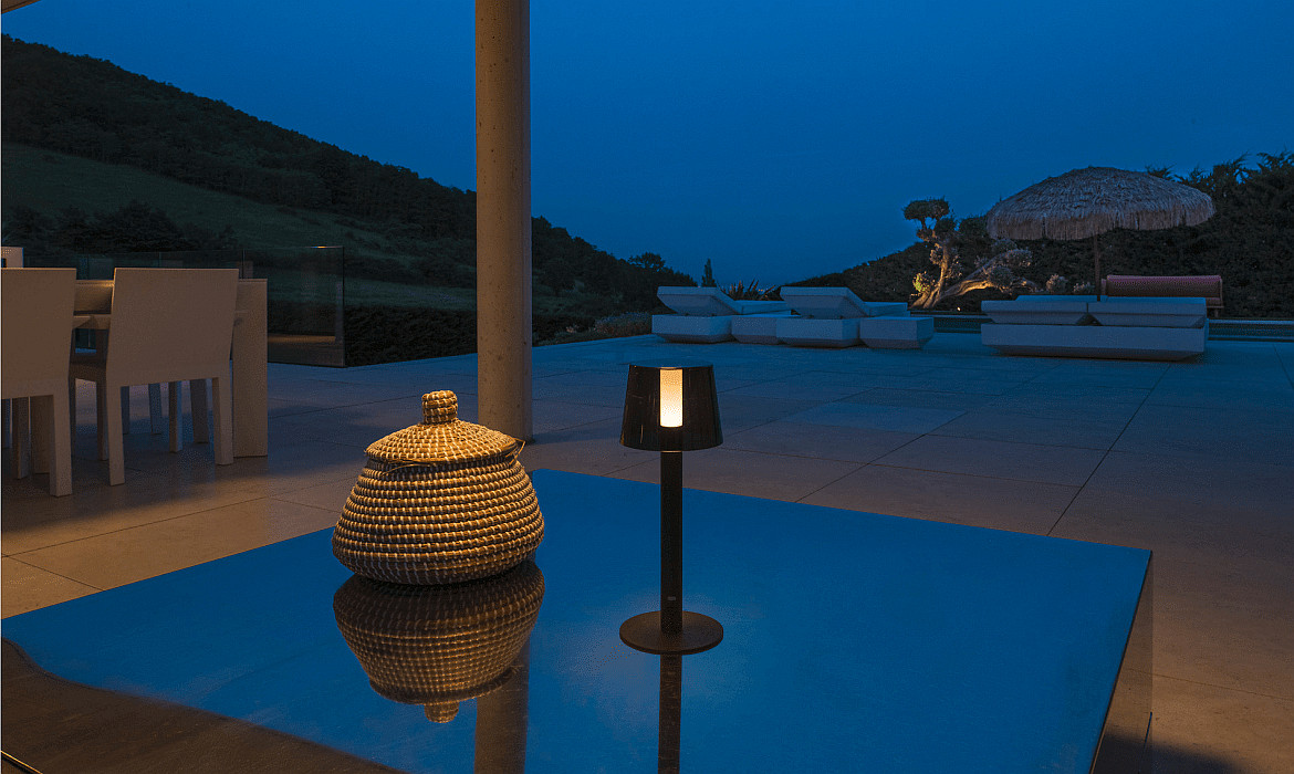 The light of the TAHA battery lamp can be adjusted stepwise via a touch dimmer on the lamp body. This allows you to adapt the brightness according to your needs and create an atmospheric lighting. The central, satin-finished diffuser ensures an even and all-around light distribution that is glare-free and pleasantly illuminates the room. The lamp is also equipped with protection class 2, ensuring safety during operation.