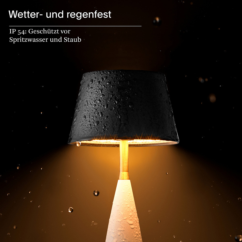 The THALA rechargeable table lamp is certified with the IP65 protection rating, meaning it is protected against dust and water jets. This robust construction ensures durability and reliable operation under various conditions. Weighing only 0.71 kg, the lamp is also easy to transport. Power is supplied via an integrated battery that allows for up to 7 hours of lighting. Charging is conveniently done via a charging station included in the scope of delivery.