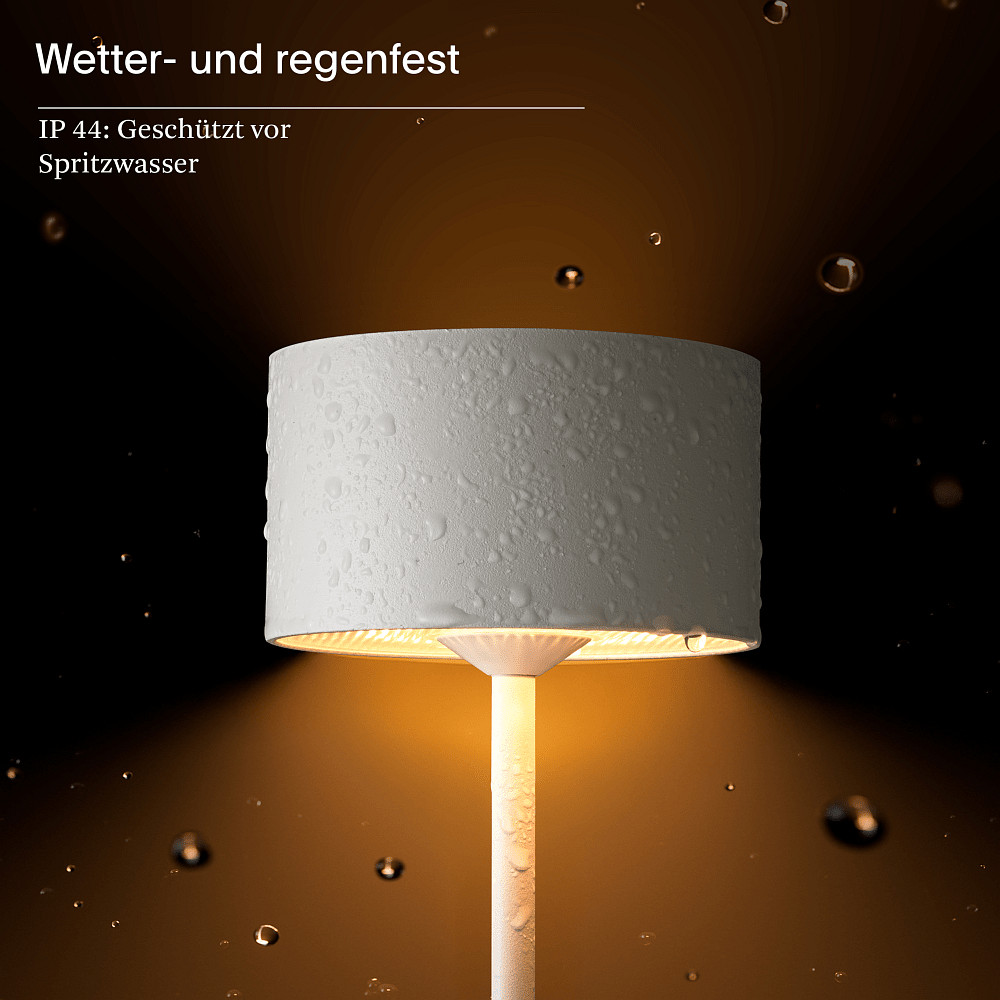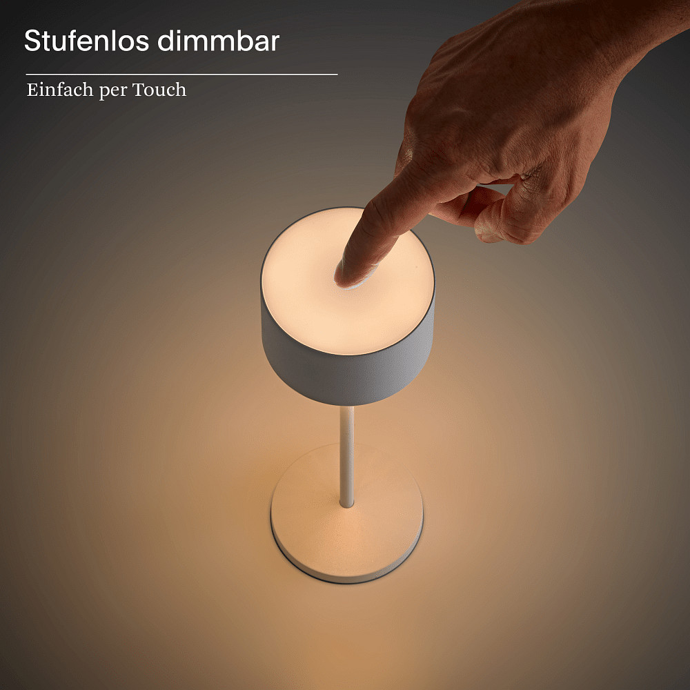 The table lamp is equipped with an integrated touch dimmer that allows continuous brightness adjustment. The power consumption is only 1 watt, making the lamp particularly energy-efficient. The IP44 protection rating guarantees safe use in various environments as it is splash-proof. The battery is replaceable and has a capacity of 3,600 mAh, enabling a maximum lighting duration of up to 14 hours.