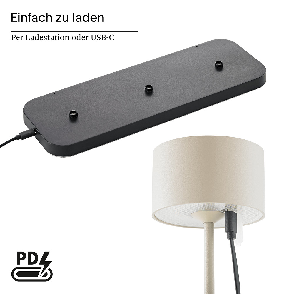 The delivery scope includes both the battery and a multi-charging station that allows charging all three lamps simultaneously. Alternatively, the lamp can be charged directly via the USB-C port on the lamp head, which is also USB-C PD compatible. These flexible charging options provide maximum convenience and easy handling in everyday use.
