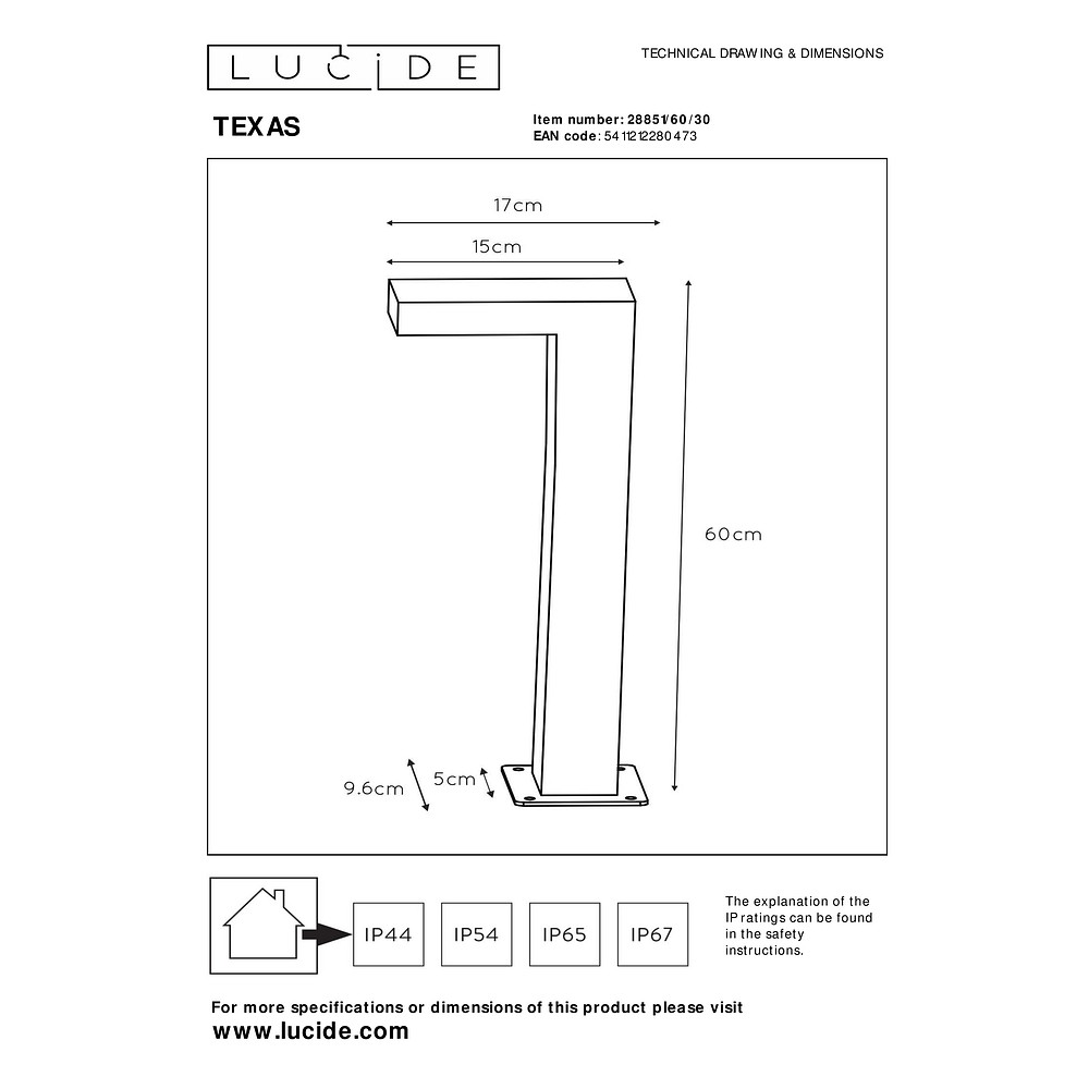 With dimensions of 9.6x15x60cm, the LED Bollard Light TEXAS is compact and discreet. It can easily be integrated into any garden or driveway and still provides effective lighting.