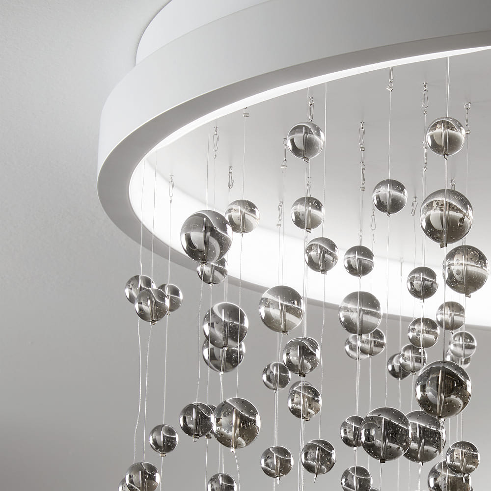 With a color temperature of 3000K and a CRI value of over 80, the ARMONY produces a pleasant warm white light with a diffuse light distribution. The hanging decorative elements made of metal wire with transparent chrome-plated glass beads also add an additional touch to the light.