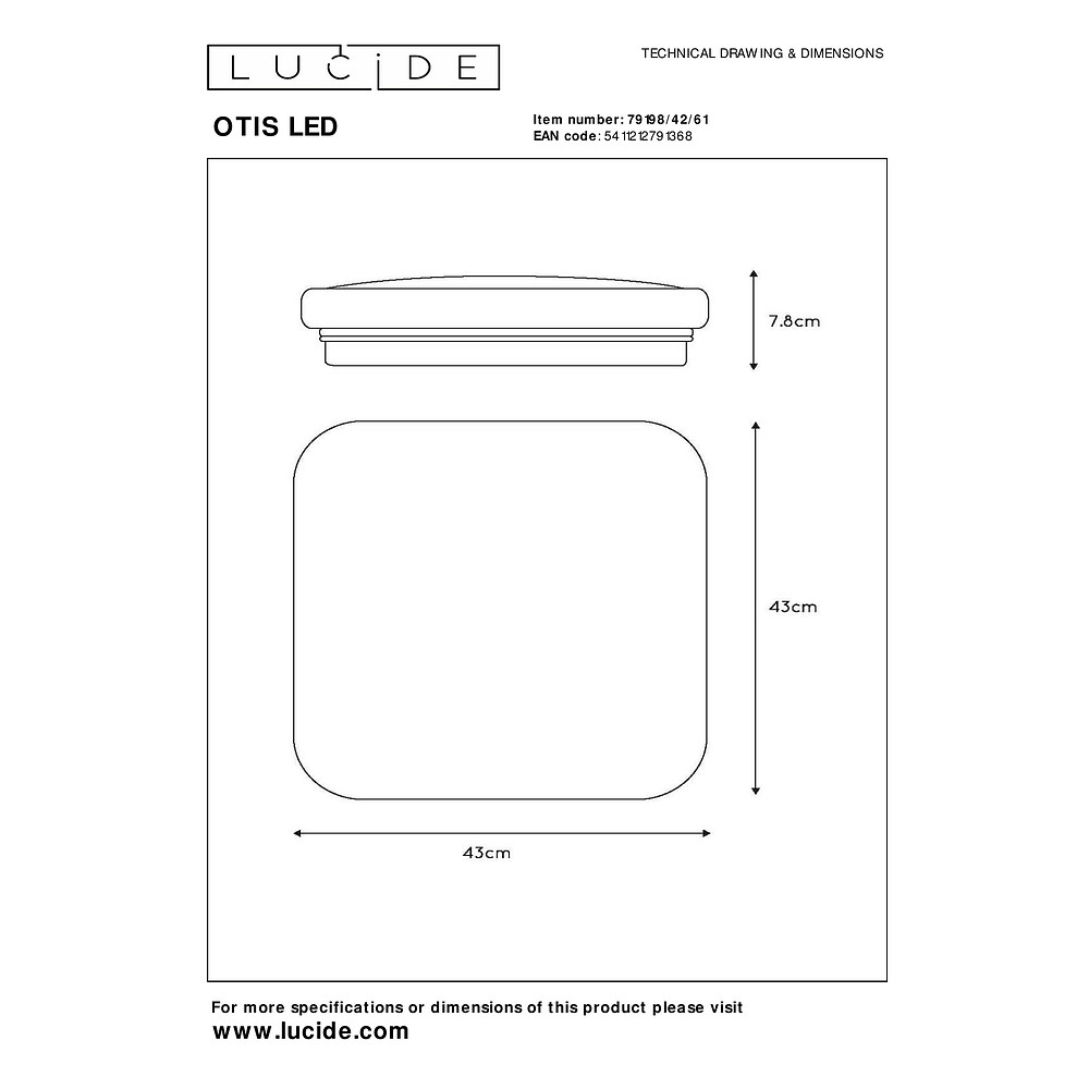 The OTIS ceiling light has a size of 43x43x7.8 cm and comes with a light source. It has an energy efficiency class of F and is not dimmable. The protection class is 1 and the IP protection rating is IP20. The ceiling light is made of high-quality plastic and has an average lamp lifespan of 15000 hours. The color temperature is 3000K and the color is opal.
