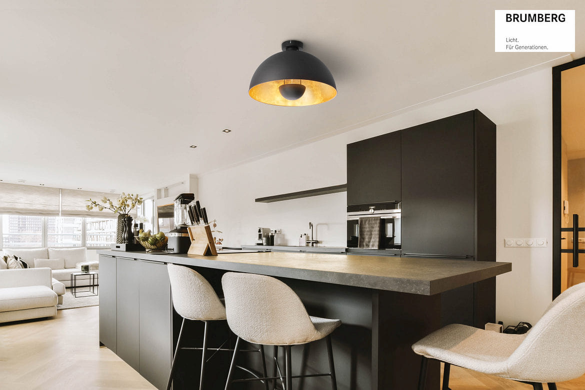 The PIERIS ceiling light features a double reflector that creates a harmonious indirect lighting effect. The matte black surface combined with the textured gold reflector ensures a particularly pleasant light distribution in the room. The light is dimmable and can be customized with compatible accessories and dimmable light sources.