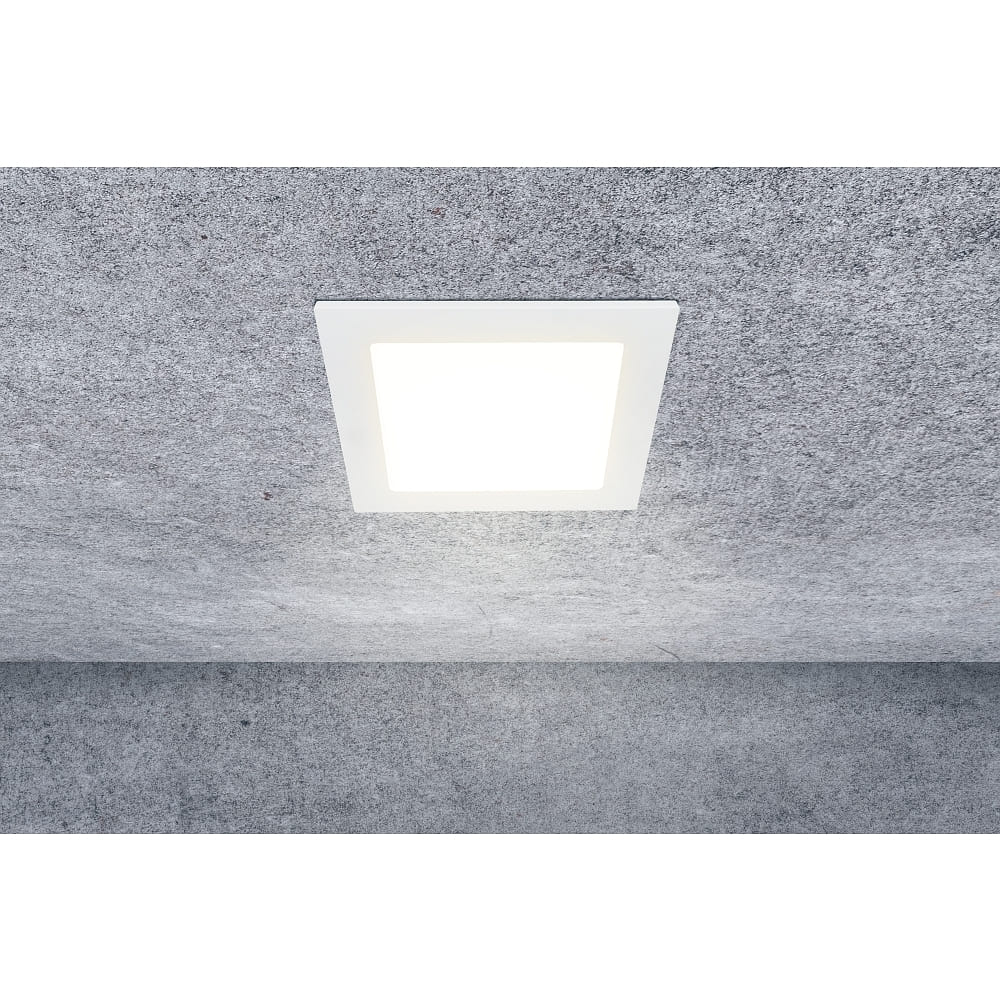 The square downlight has dimensions of 16.5 x 16.5 x 3.2 cm and is ideal for indoor use. With an IP44 protection rating, the luminaire is protected against splashing water. The dimmability of the downlight is done via phase cut.