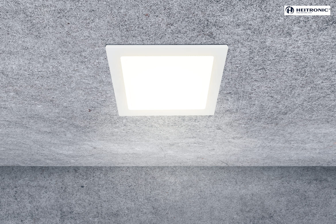 The square downlight has dimensions of 22 x 22 x 3.2 cm and a very low installation depth of only 2.7 cm. The color temperature can be set before installation using a slide switch, with options of 3000K, 4000K, and 6000K. The LED is dimmable and has a color rendering index of 80Ra.