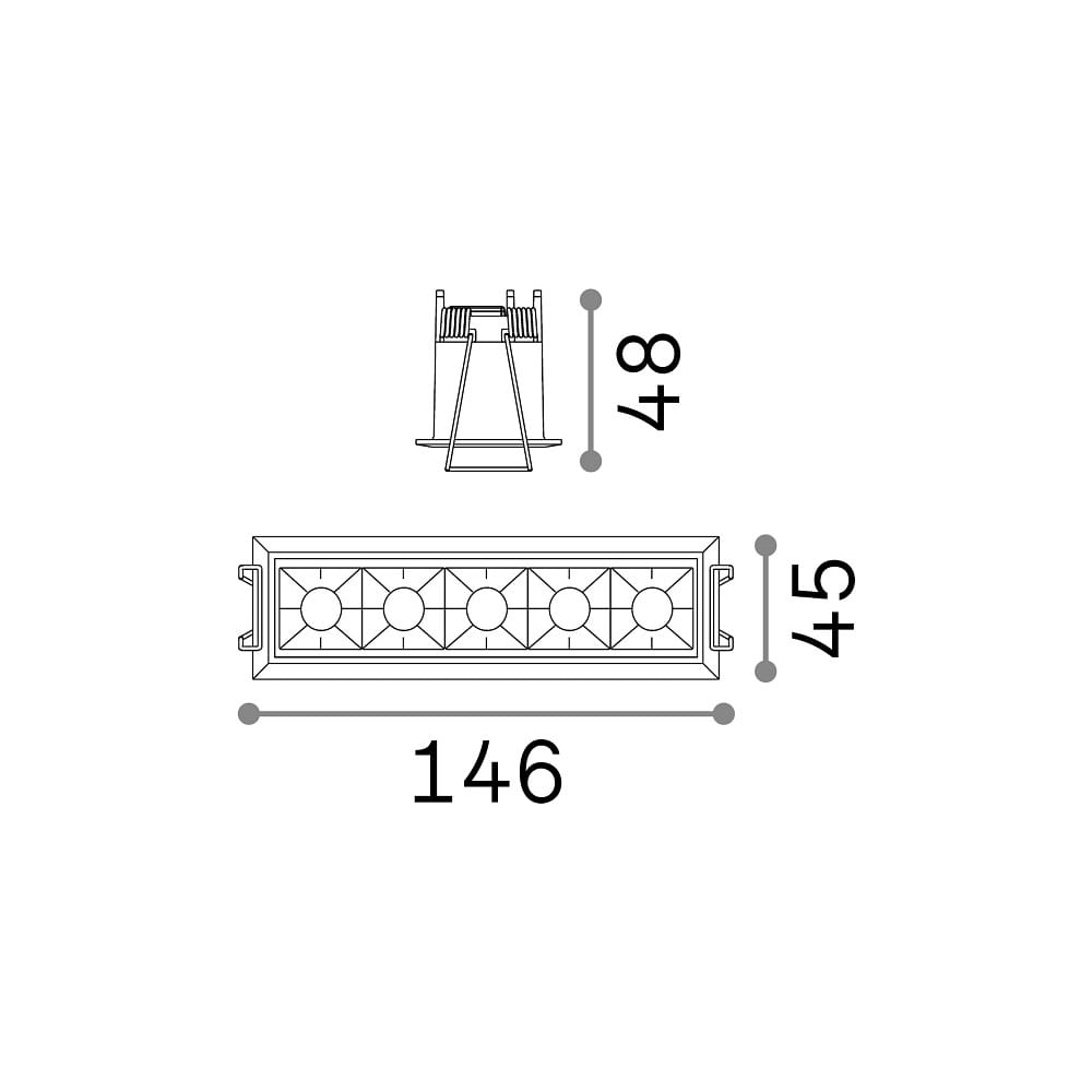 The LED recessed ceiling spotlight comes with clip springs and driver. The switchable ON/OFF driver is included, while a dimmable driver (DALI) is available separately. Installation is done via a clamp on an external driver, and the recessed opening has a rectangular shape with dimensions of 14cm x 3.7cm.