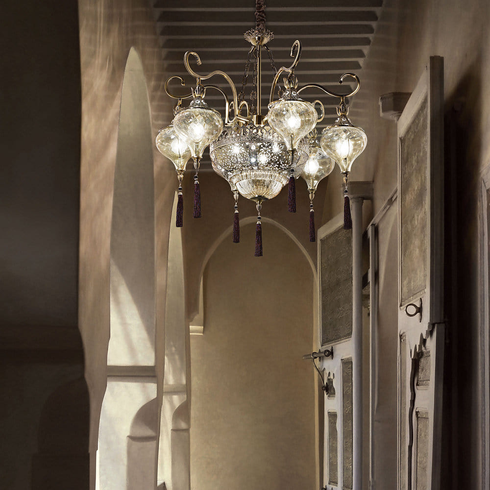 The chandelier HAREM SP9 is an elegant lighting element with a nostalgic touch. Equipped with 9 E27 sockets, it can accommodate up to 60W bulbs. The antique brass finish gives it a noble and timeless look that creates a cozy atmosphere in any room.