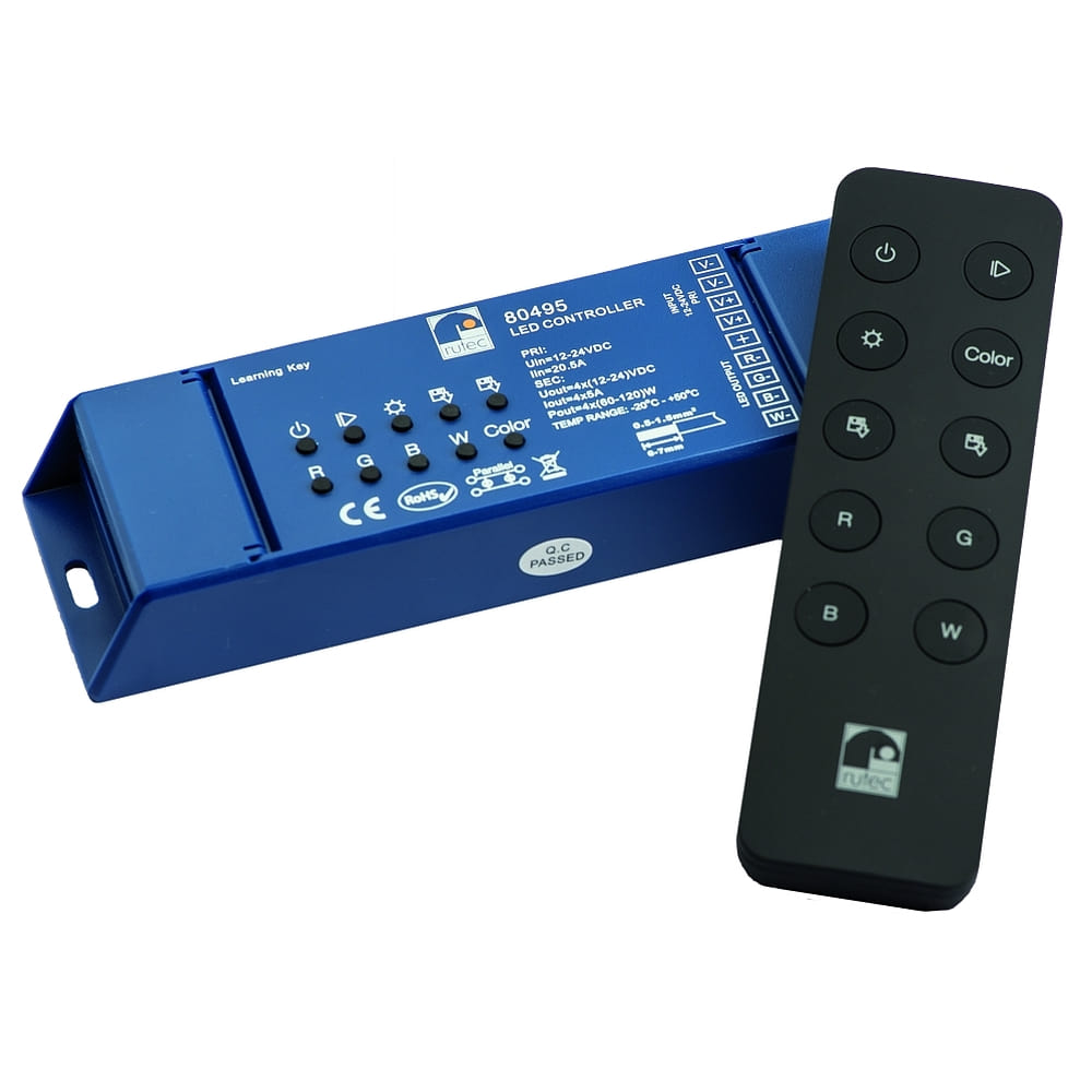 The item number of this controller is RUP-PHZ495. It is delivered as a set, consisting of the radio controller (RGBW) and a radio remote control with magnetic wall mount. The range of the remote control is up to 30 meters.