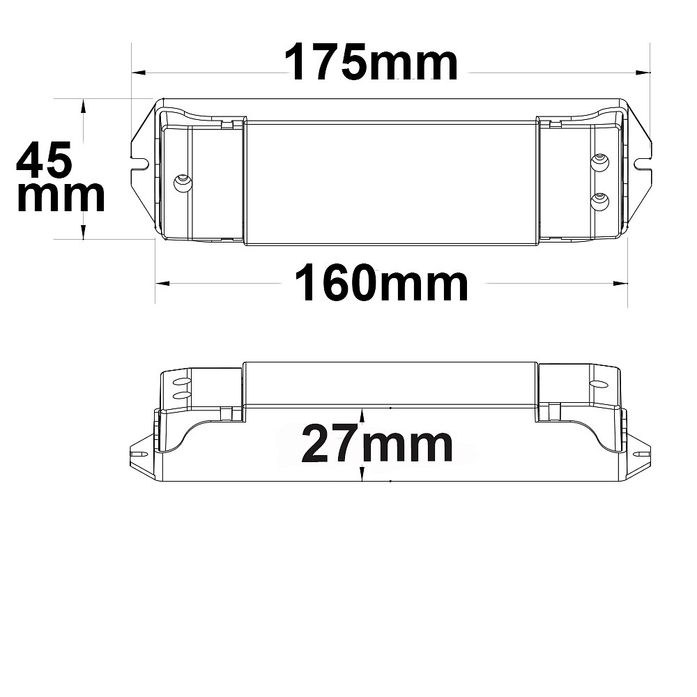 The size of the controller is L/W/H: 17.5/4.5/2.7 cm. It is in a matte white color tone and suitable for exclusive indoor use. The IP protection class is IP20. The controller features a phase or section dimmer and can be controlled with an incoming 40-230V AC sine wave modulated control signal.