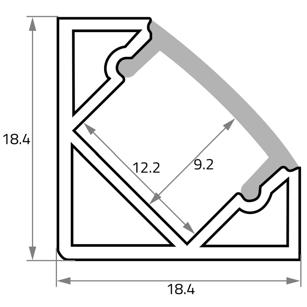 The EP18/18 corner profile is offered as a practical product type that is precisely tailored to the needs of LED strips. The exact dimensions of 200 x 1.84 x 1.84 cm ensure a precise installation and optimal light distribution. The maximum width of 1.22 cm allows for the use of various LED strips.