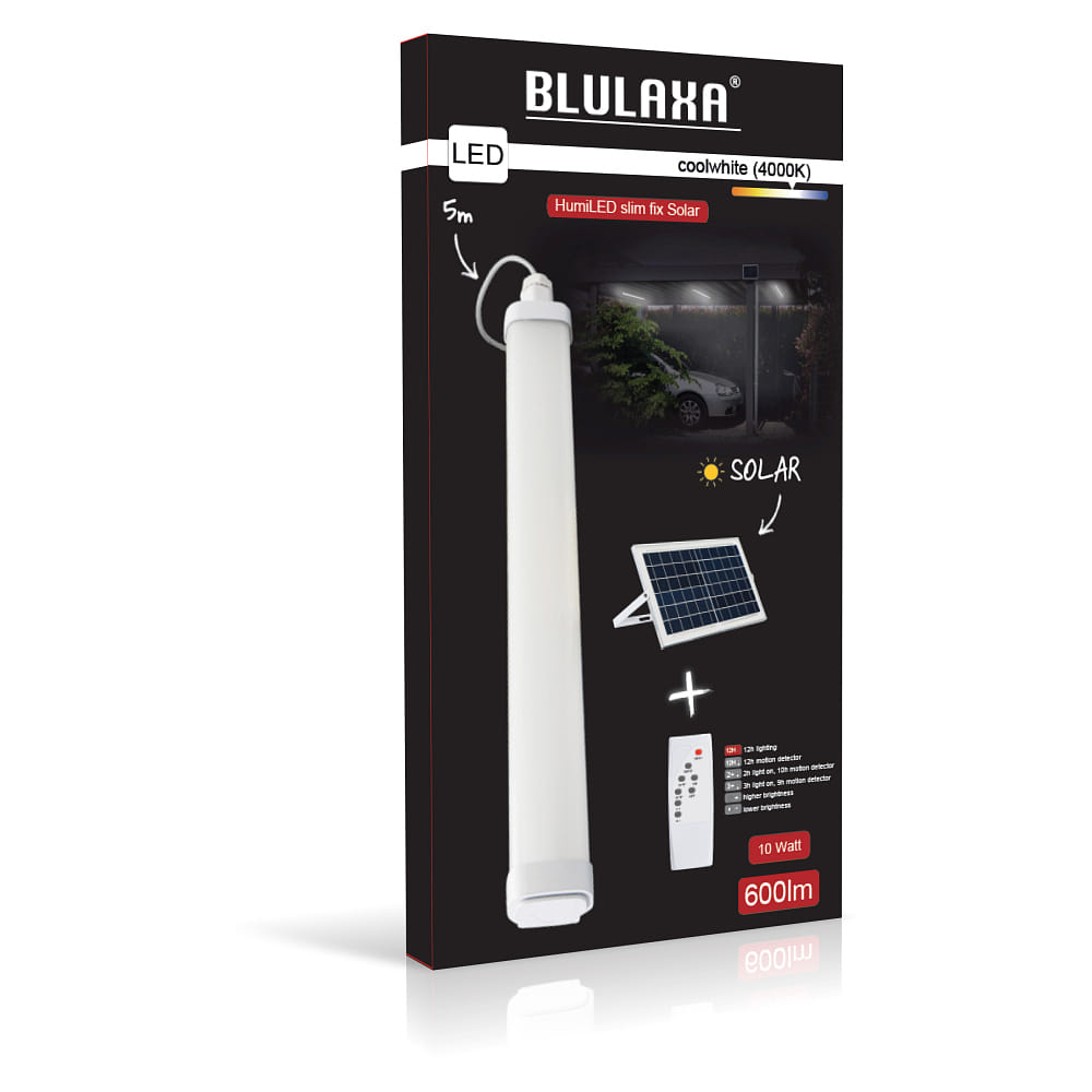 The LED Solar Moisture-proof luminaire HUMILED SLIM FIX from Blulaxa is an energy-saving lighting solution for indoor and outdoor areas. With a power consumption of 10W and a luminous flux of 600lm, it provides bright and pleasant lighting.