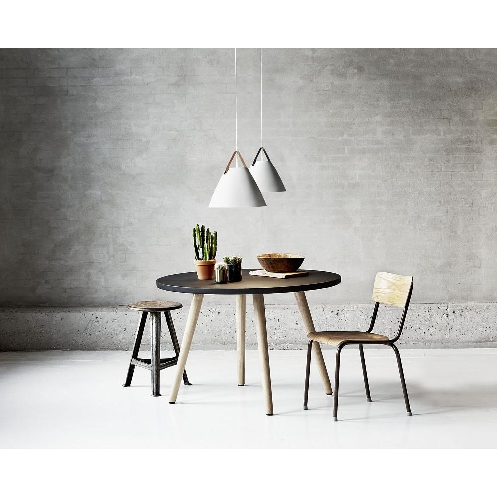 Die Pendelleuchte STRAP 36 besteht aus einer Kombination von Metall, Leder und PVC, was nicht nur für eine ansprechende Optik sorgt, sondern auch für Langlebigkeit und Stabilität. Das weiße Stoffkabel rundet das Design perfekt ab.
