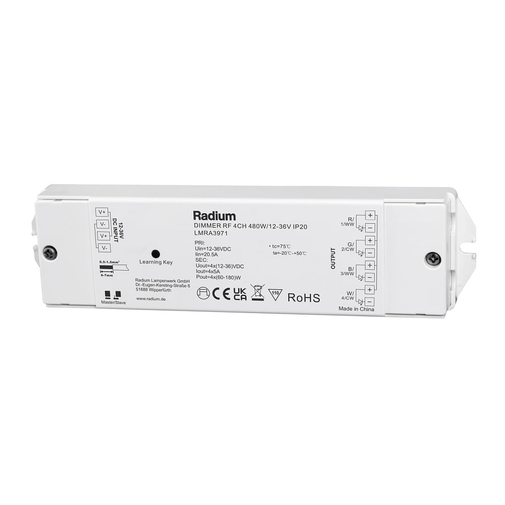 The Smarter Dimmer DIMMER RF 4CH from Radium is a versatile 4-channel dimmer specifically designed for easy control of RGB lighting and white light sources. It supports an operating voltage of 12 to 36 volts DC and offers a maximum control load of 480 watts. With this dimmer, you can precisely adjust the brightness on different channels to create individual lighting moods. Control is conveniently carried out via a radio remote control, which is available separately.