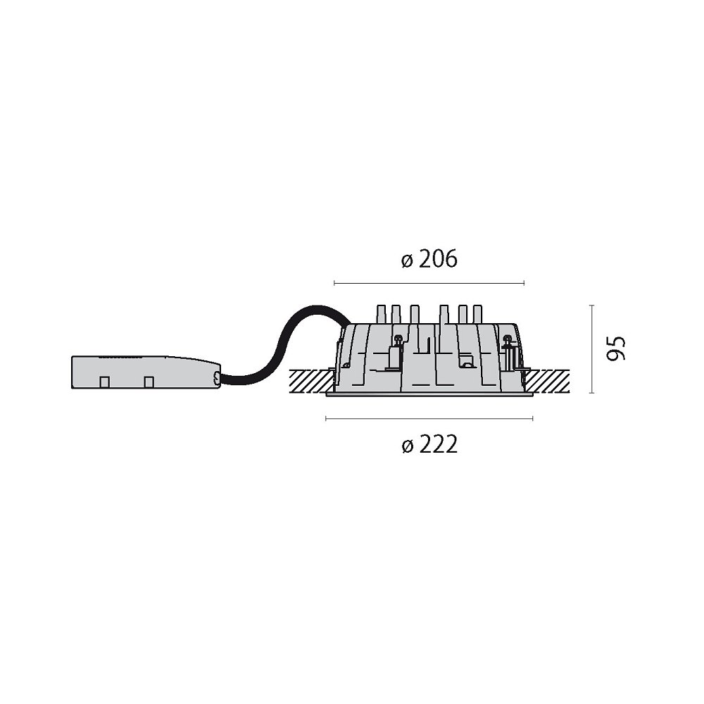 Installation is easy through recessed mounting, and the through-wiring allows for the installation of multiple luminaires in a row. The connection is simple and secure thanks to the plug-in terminal power supply. The dimming of the Downlight includes various options such as DALI, push dimmer, and touch dimmer.