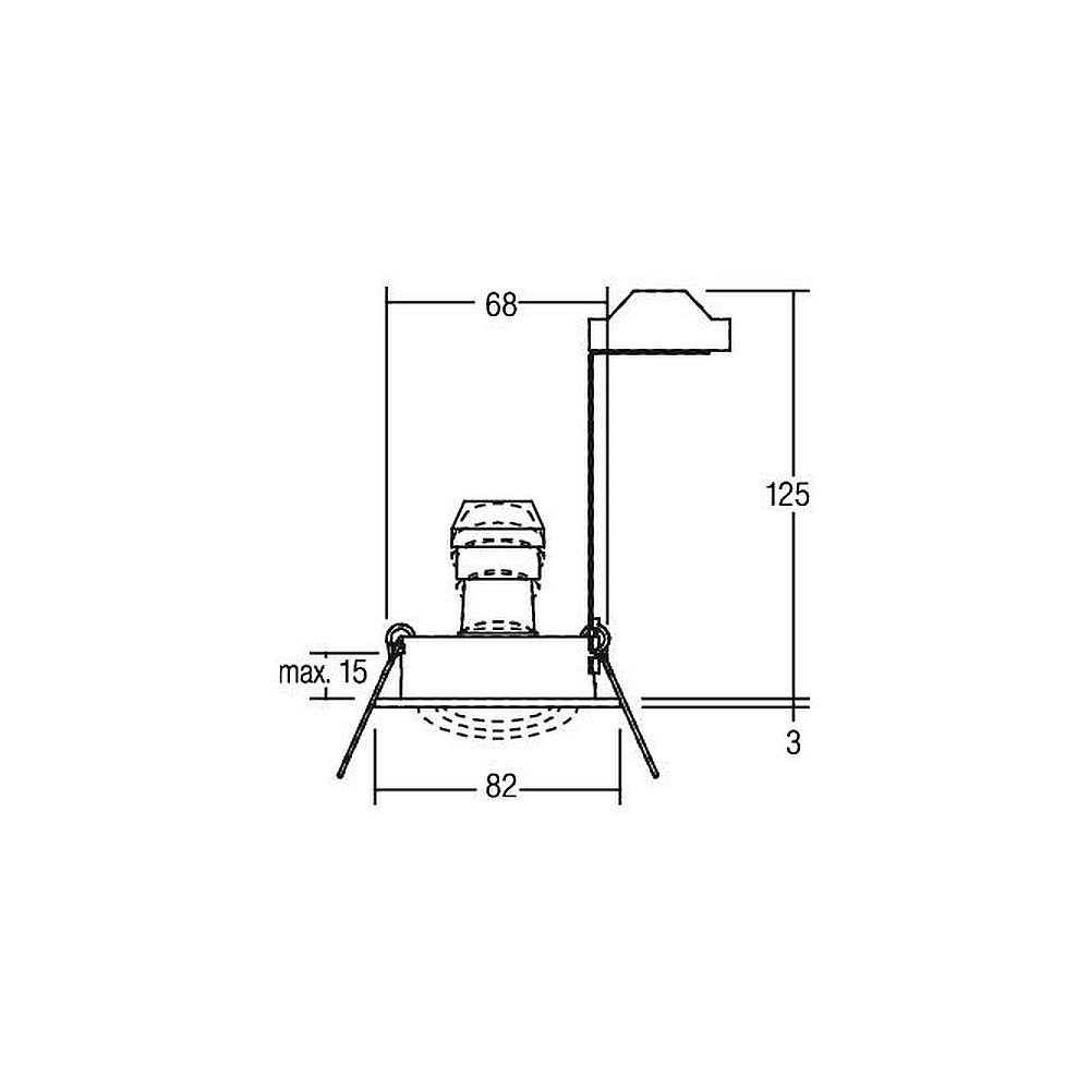 Der Einbaustrahler hat eine Gesamtgröße von 8,2 cm im Durchmesser und 12,8 cm in der Höhe. Der sichtbare Teil des Strahlers hat einen Durchmesser von 8,2 cm und eine Höhe von 0,3 cm. Die Einbautiefe beträgt 12,5 cm und die Einbauöffnung hat einen Durchmesser von 6,8 cm. Mit einer IP-Schutzart von IP20 ist der Strahler vor Staub und Berührung geschützt.