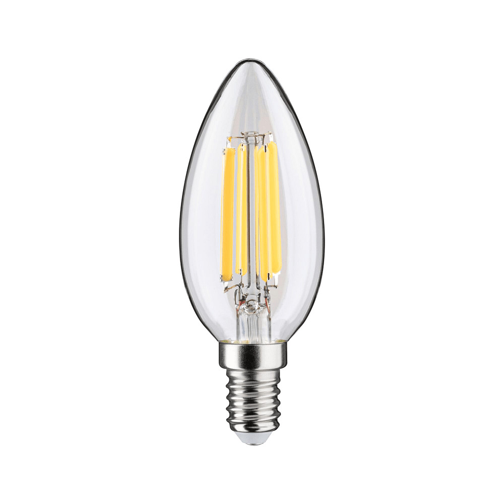 The LED filament candle-shaped ECO-LINE from Paulmann impresses with its exceptional energy efficiency and attractive design. With a power consumption of only 2.5 watts, this lamp delivers a luminous flux of 525 lumens, which corresponds to a conventional incandescent lamp with 43 watts. Thanks to the clear glass bulb and slim candle shape, it is not only functional but also highly decorative. The lamp features an E14 base and measures 3.5 cm in diameter with a length of 9.8 cm.