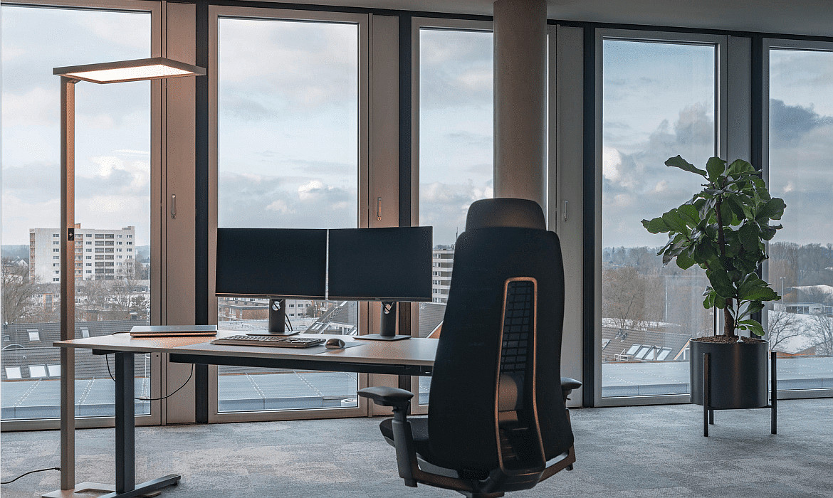With a UGR value of less than 19, the LED office floor lamp WORKLIGHT offers glare-free lighting that protects the eyes and promotes concentration. Thanks to the integrated touch dimmer, you can easily adjust the brightness.